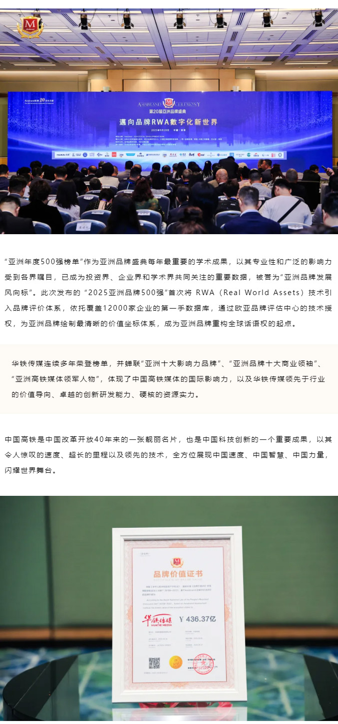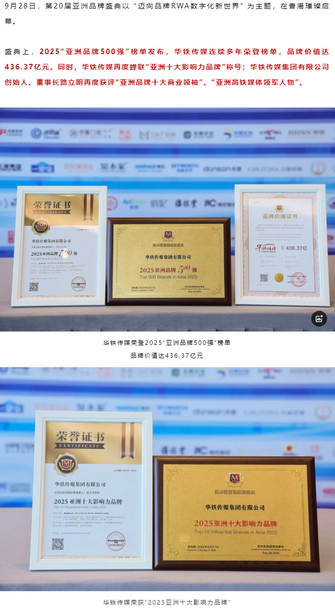 华铁传媒再度蝉联亚洲品牌500强榜单,实力斩获三项大奖!