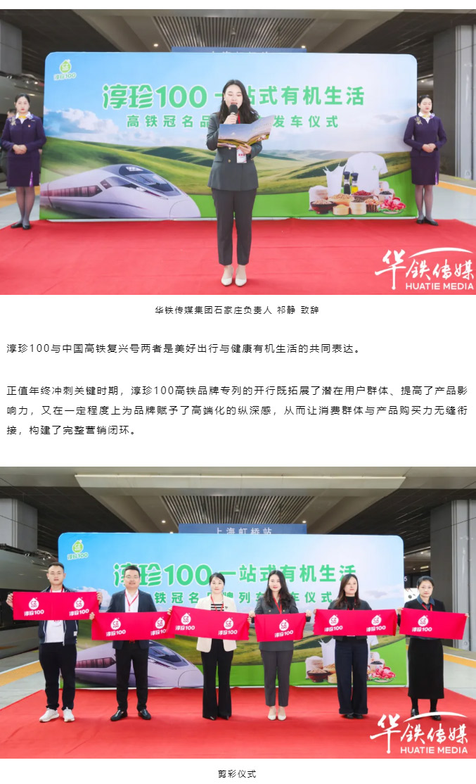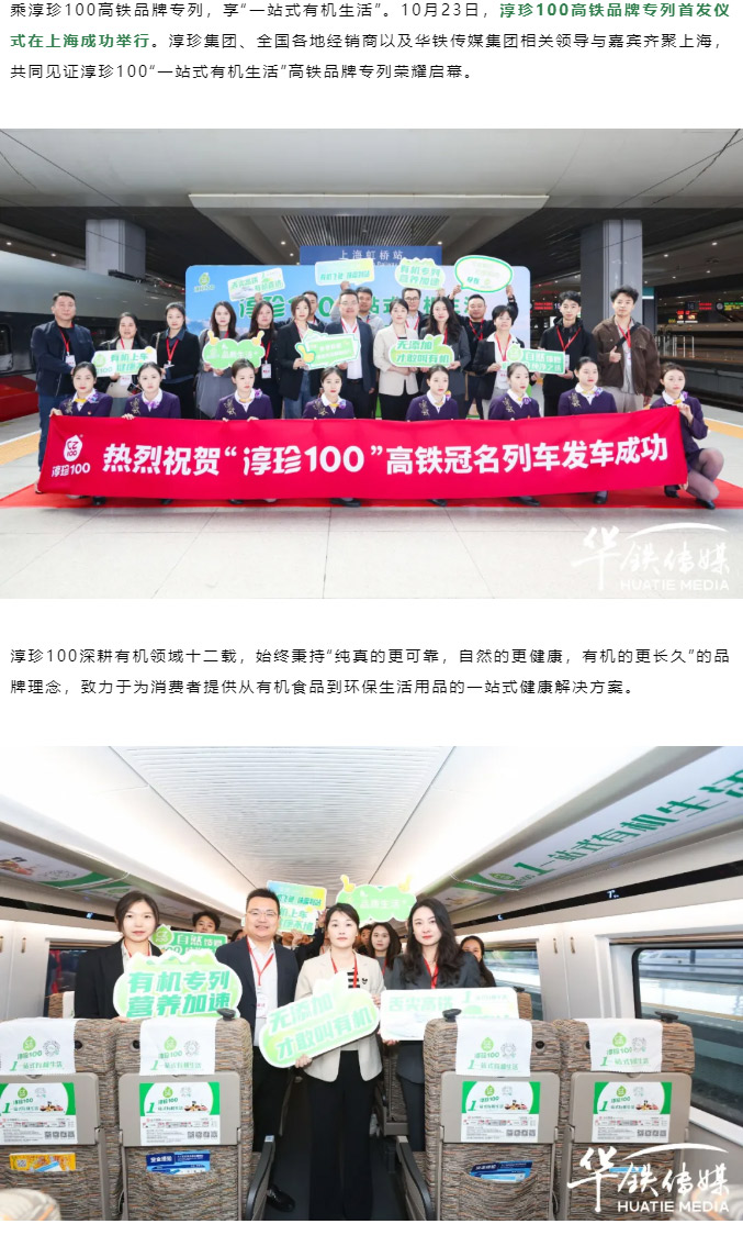 乘淳珍100高铁品牌专列,享“一站式有机生活”。10月23日,淳珍100高铁品牌专列首发仪式在上海成功举行。淳珍集团、全国各地经销商以及华铁传媒集团相关领导与嘉宾齐聚上海,共同见证淳珍100“一站式有机生活”高铁品牌专列荣耀启幕。