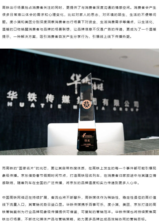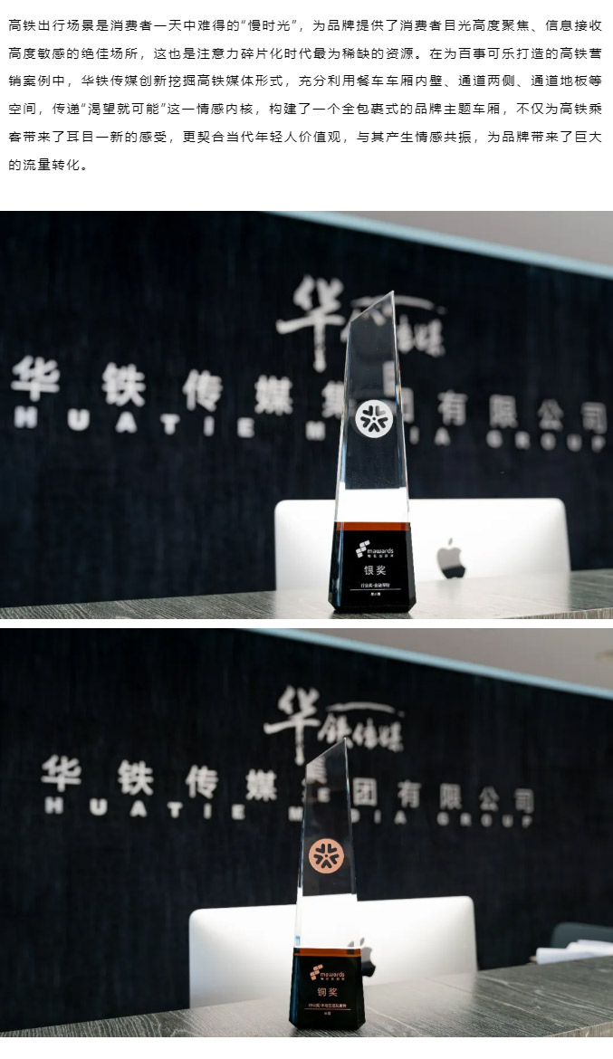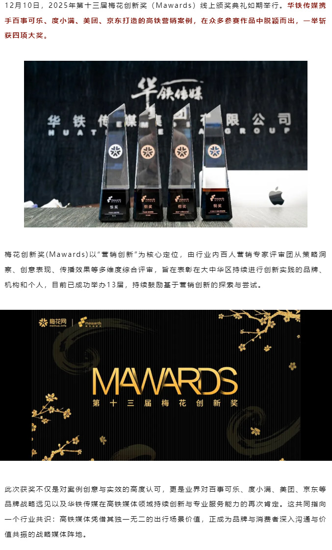 12月10日,2025年第十三届梅花创新奖(Mawards)线上颁奖典礼如期举行。华铁传媒携手百事可乐、度小满、美团、京东打造的高铁营销案例,在众多参赛作品中脱颖而出,一举斩获四项大奖。