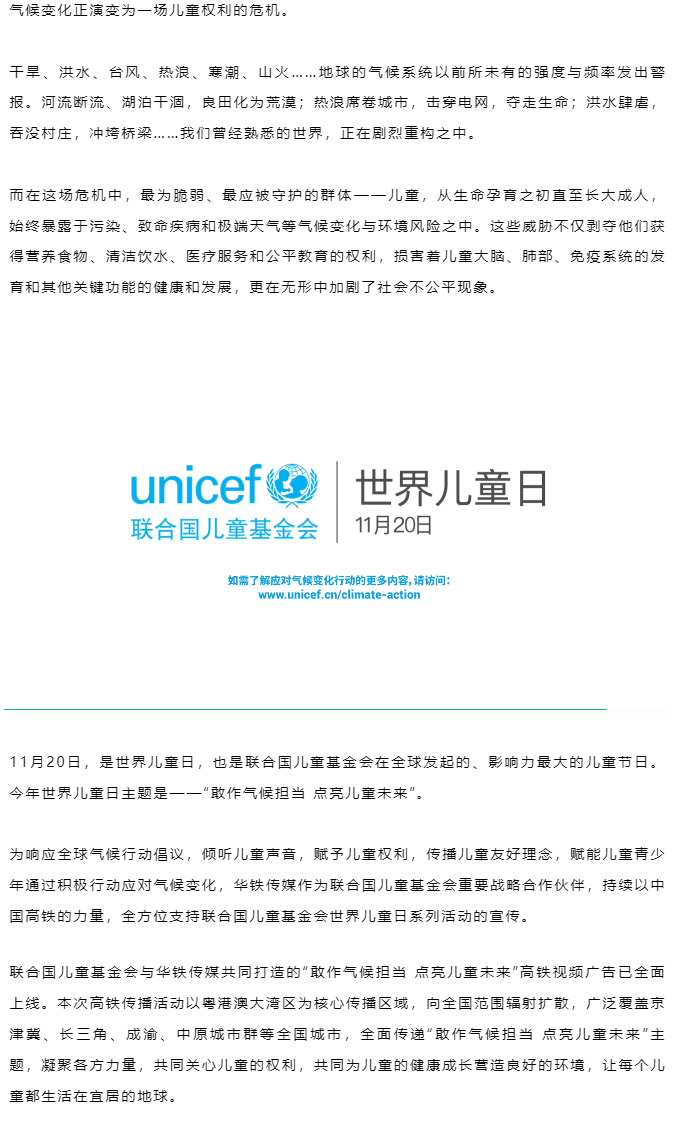 11月20日,是世界儿童日,也是联合国儿童基金会在全球发起的、影响力最大的儿童节日。今年世界儿童日主题是——“敢作气候担当 点亮儿童未来”。