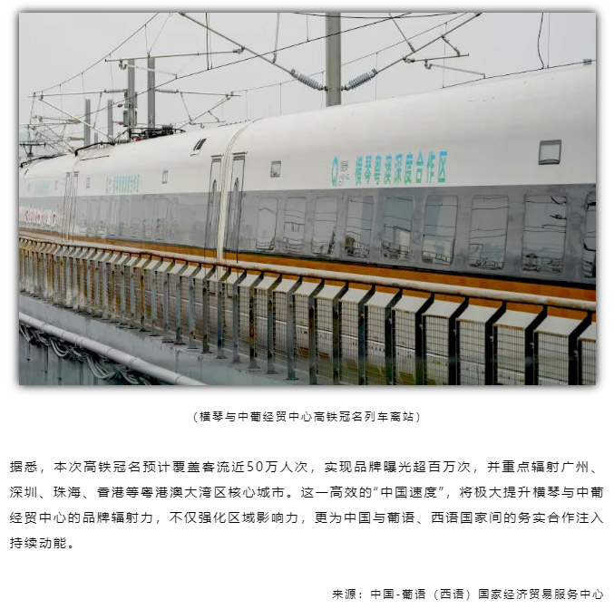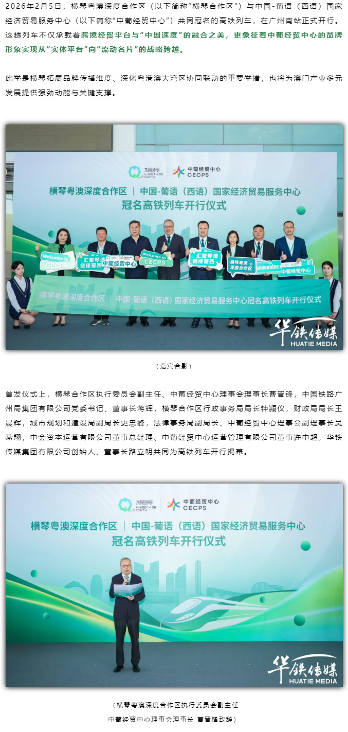 2026年2月5日,横琴粤澳深度合作区(以下简称“横琴合作区”)与中国-葡语(西语)国家经济贸易服务中心(以下简称“中葡经贸中心”)共同冠名的高铁列车,在广州南站正式开行。