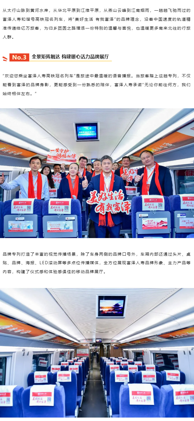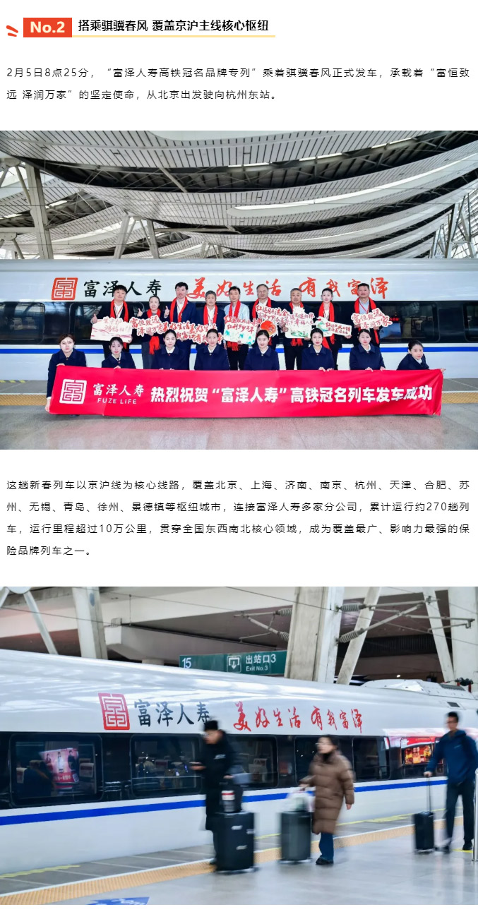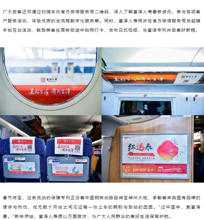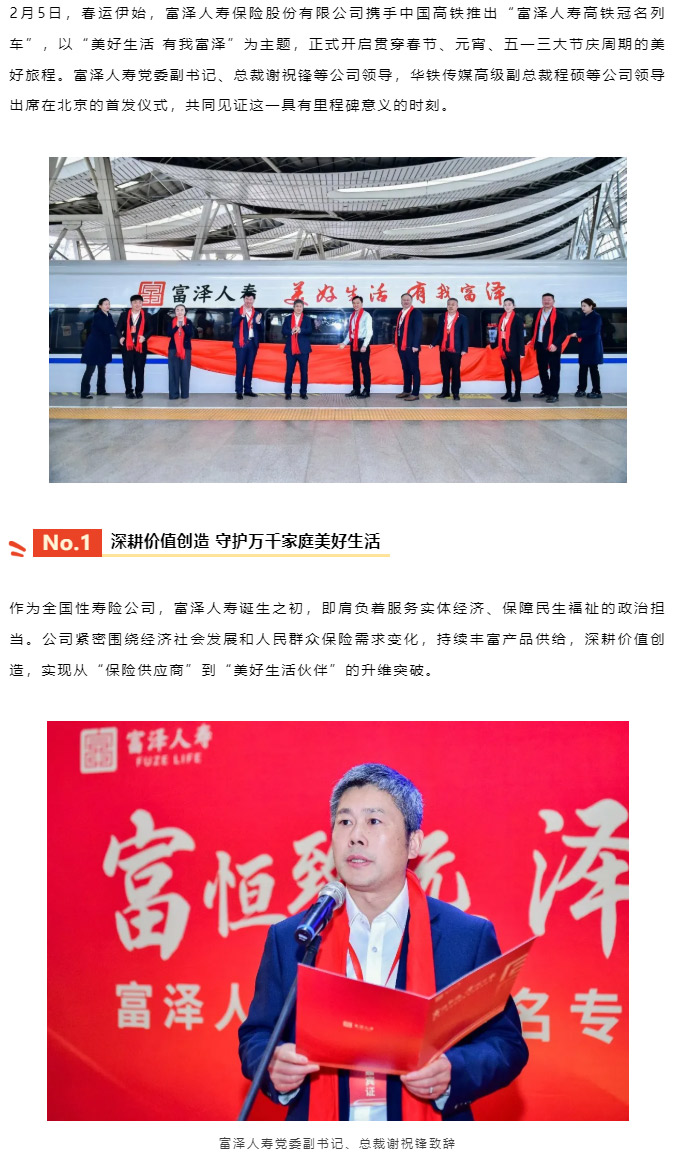 2月5日,春运伊始,富泽人寿保险股份有限公司携手中国高铁推出“富泽人寿高铁冠名列车”,以“美好生活 有我富泽”为主题,正式开启贯穿春节、元宵、五一三大节庆周期的美好旅程。