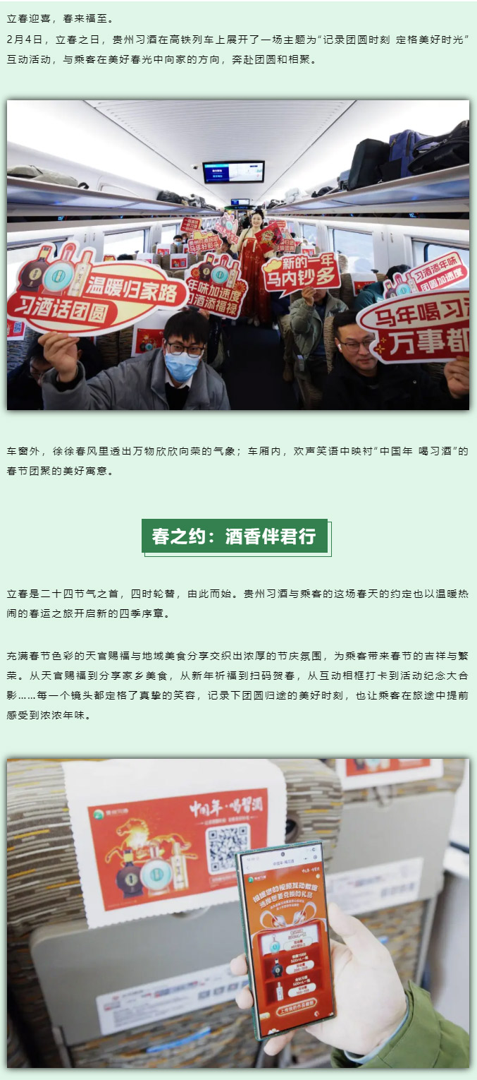 2月4日,立春之日,贵州习酒在高铁列车上展开了一场主题为“记录团圆时刻 定格美好时光”互动活动,与乘客在美好春光中向家的方向,奔赴团圆和相聚。