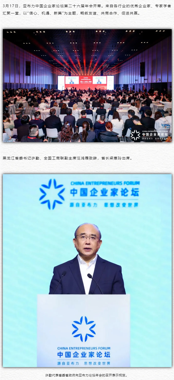 3月17日,亚布力中国企业家论坛第二十六届年会开幕。来自各行业的优秀企业家、专家学者汇聚一堂,以“信心、机遇、新篇”为主题,畅叙友谊、共商合作、促进共赢。