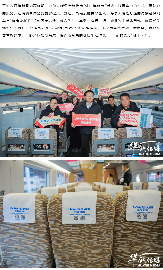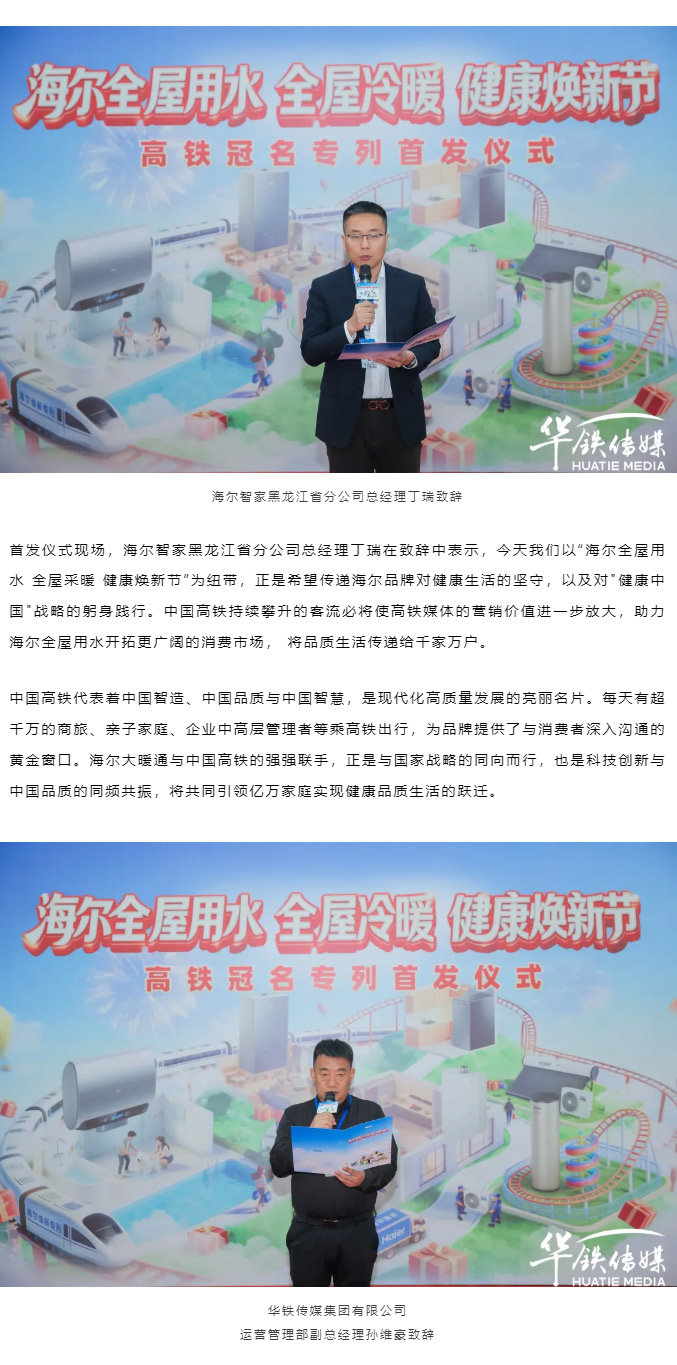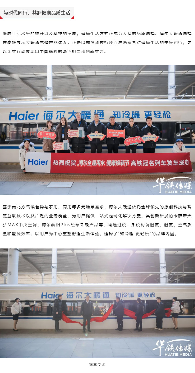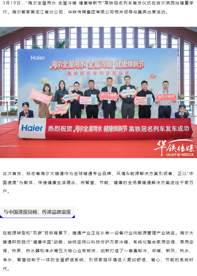 3月19日,“海尔全屋用水 全屋冷暖 健康焕新节”高铁冠名列车首发仪式在哈尔滨西站隆重举行。海尔智家黑龙江省分公司、华铁传媒集团有限公司相关领导与嘉宾出席活动。